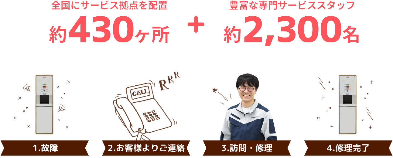 万一の故障の際も全国約430ヶ所の全国ネットワークから、最寄りのサービススタッフが即座に駆けつけ、修理対応するので安心です。